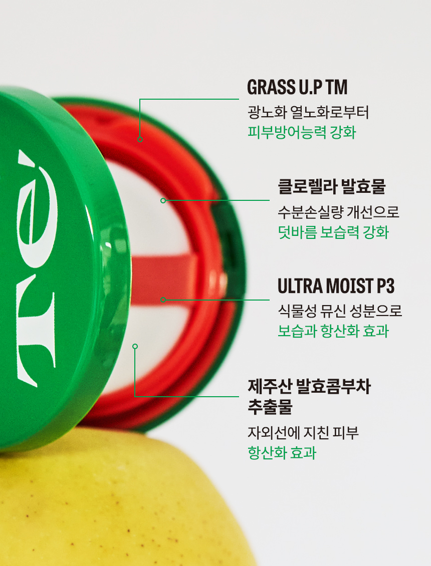 Te GRASS CHOROK 35 (테 풀 초록 35) 선쿠션의 ‘35’는 제품의 SPF 수치입니다. SPF35도 일상생활에서 충분히 자외선 차단이 된다는 사실 알고 계신가요? 선케어에서는 높은 수치보다 얼마나 자주 덧바르는지가 더 중요하기 때문에 Te’는 국내산 무기자차 원료로 발림성이 좋은 쿠션을 만드는 데 집중했습니다.